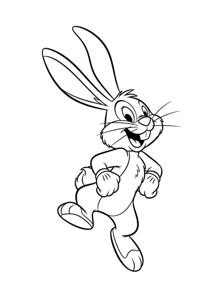 This coloring page shows an absolutely irrepressible little rabbit mid-stride, caught in that perfect moment where all four limbs are going at once and the joy is just radiating off the page. His enormously long ears shoot straight up to the top of the page, his wide eyes are full of mischief and glee, and his mouth is open in a huge delighted laugh that makes him look like he is either very late for something or just incredibly excited about where he is going. Long thin whiskers extend out from either side of his fuzzy face, and small detail lines around his paws, chest, and cheeks suggest soft fluffy fur without overcomplicating the design. The line work is bold and energetic throughout, perfectly matching the bouncy personality of the character, and the clean white background lets all that wonderful movement really shine.