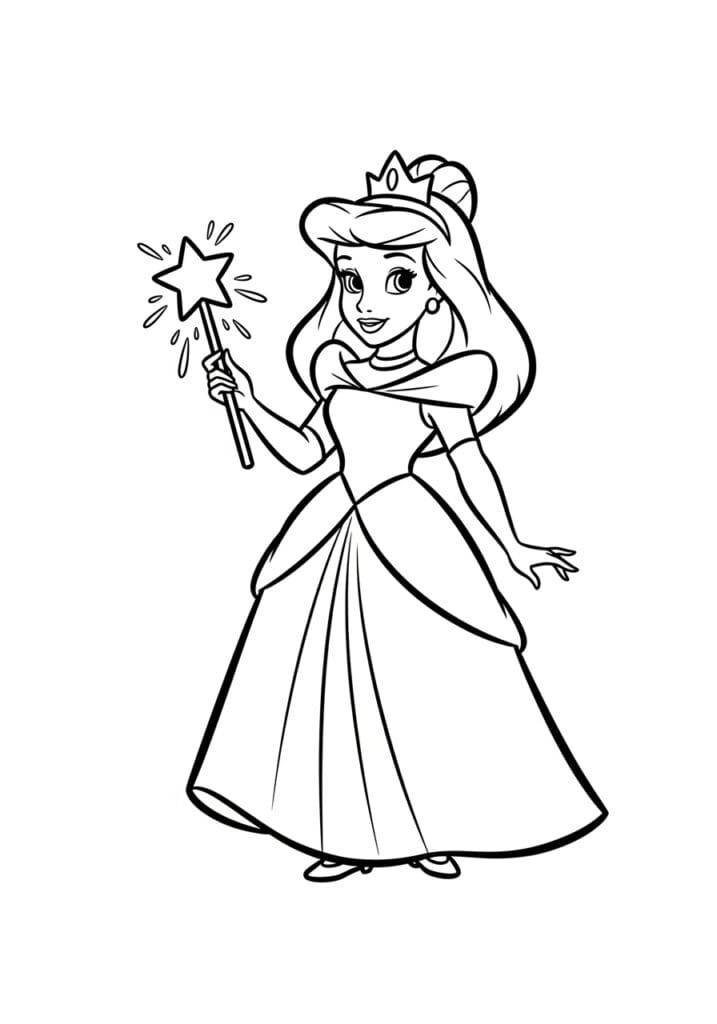 What I love so much about this particular page is that it gives you two very distinct coloring experiences in one. The big sweeping skirt is this wonderfully relaxing open space that you can fill with long smooth strokes of color, and then the sparkling wand on the other side gives you that fun energetic moment where you get to decide just how magical and glittery things are going to get. I always make those sparkle lines around the star tip extra bright, usually a vivid yellow or a warm gold, because it makes the whole page feel like the magic is actually working. The crown is another favorite detail of mine and looks incredible picked out in a warm metallic tone against the softness of her hair.