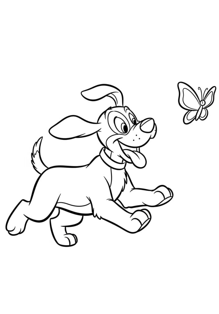 This coloring page captures a totally chaotic and completely joyful moment of a fluffy puppy in full sprint mode, tongue flapping out the side of his mouth, ears flying back, and one paw reaching forward as he zeroes in on a delicate little butterfly fluttering just out of reach on the right side of the page. His expression is pure unfiltered excitement with wide focused eyes and that classic goofy open-mouthed dog grin that is honestly impossible not to love. The butterfly itself is drawn with lovely symmetrical wings and fine inner line details that make it a sweet little focal point on its own. Fluffy fur texture is suggested around his chest, tail, and legs with short soft strokes, while the bold outer lines keep everything clean and well-defined throughout the whole composition.