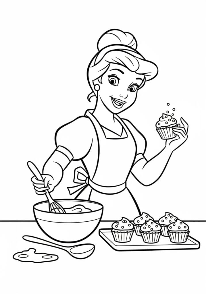 This page makes me so happy because it takes the classic princess concept and gives her something genuinely fun and real to do, and I am fully here for a princess who bakes. The cupcakes are my absolute favorite part to color because each one is its own tiny little project and you can make them all the same flavor or go wild and give each one a different frosting color. I love doing soft pastel swirls on the tops with tiny dots of contrasting color for the sprinkles. The apron is another great creative moment because you can pick any color you like and it instantly gives the whole character a fresh and personal feel. It is a page that feels cozy and fun and just a little bit whimsical all at once.