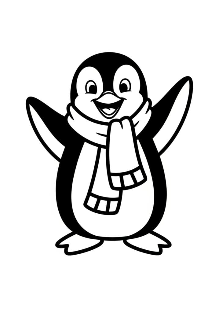 This coloring page features the most gleeful little penguin standing front and center with both flippers spread wide open like he is about to give the world’s most enthusiastic hug, his little beak open in a huge delighted smile that is honestly contagious just looking at it. A chunky scarf is wrapped snugly around his neck and hangs down his front, with neat horizontal stripe details and a small gathered section near the top where it bunches up adorably under his chin. The penguin’s classic black and white coloring is already partially defined in the artwork itself, with the bold solid black areas on his head, back, and flippers forming strong graphic shapes that give this page a really striking and clean visual contrast. His round white tummy, soft facial features, and little flat feet at the bottom round out a design that is bold, simple, and completely full of charm.