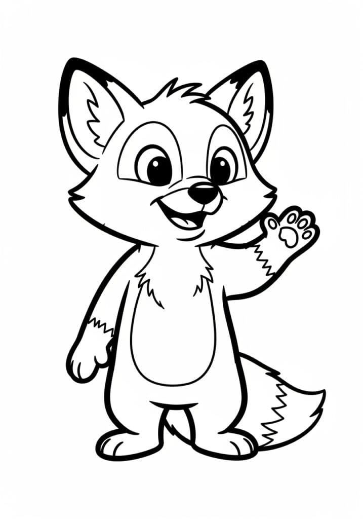 This coloring page features the sweetest little fox cub standing upright and waving one paw forward with a big friendly grin, like he has just spotted you across the forest and could not be more thrilled about it. His oversized round head is framed by two large pointed ears with jagged fur detail inside, and his face has that classic cartoon fox mask shape with a lighter muzzle area surrounding his little black nose and open happy mouth. Small spiky fur texture lines are scattered across his chest, inner ears, cheeks, and the tip of his fluffy tail curling out to one side, giving the whole character a lovely soft and touchable quality. The raised paw facing outward shows off an adorable detailed paw pad, which is genuinely one of the cutest little details on the whole page, and the bold clean outlines throughout make every section really easy to identify and color with confidence.