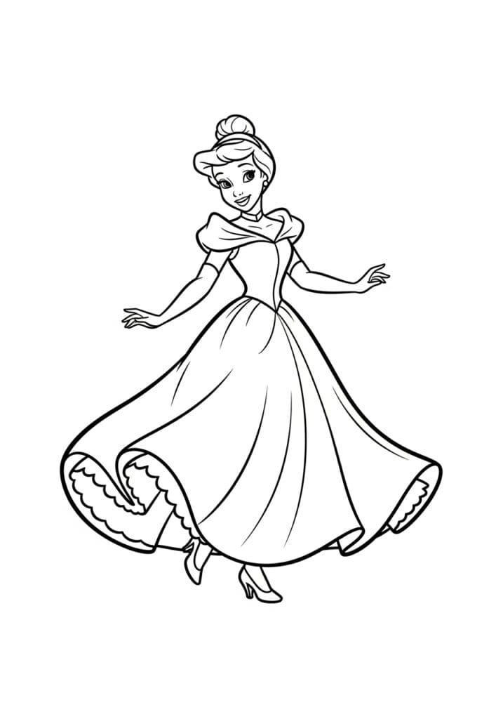 I genuinely think this page is one of the most satisfying princess pages to color because that big billowing skirt is basically a dream canvas. You can go classic with soft baby blues, try an ombre effect from pale lavender to lilac, or even get a little bold with something unexpected like rose gold. The scalloped petticoat details at the hem are such a fun little bonus because they add texture and interest without being hard to fill in. This is the kind of page that feels like a proper coloring session, the sort where you put on a good playlist, get your favorite markers out, and just enjoy every single section of it from the top of her updo all the way down to that little glass slipper.