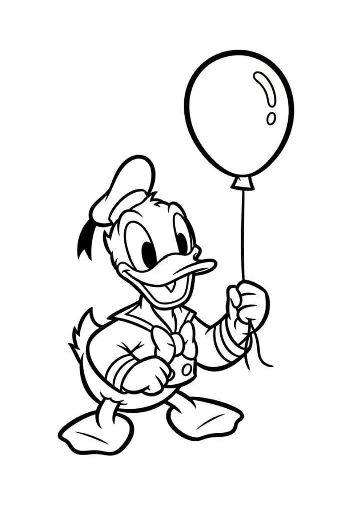 This coloring page features everyone’s favorite feisty little duck in his classic sailor outfit, strutting along happily while holding a round balloon on a string. He’s got his signature cap tilted to the side, his wide bill curved into a big grin, and his little sailor top with a bow tie that is honestly just too cute for words. The line work is bold and chunky throughout, with thick outlines around the main character that make every section super easy to identify and stay within. The balloon floats up in the top right corner of the page, connected by a thin string wrapped around his hand, which creates a really nice visual balance across the whole composition.