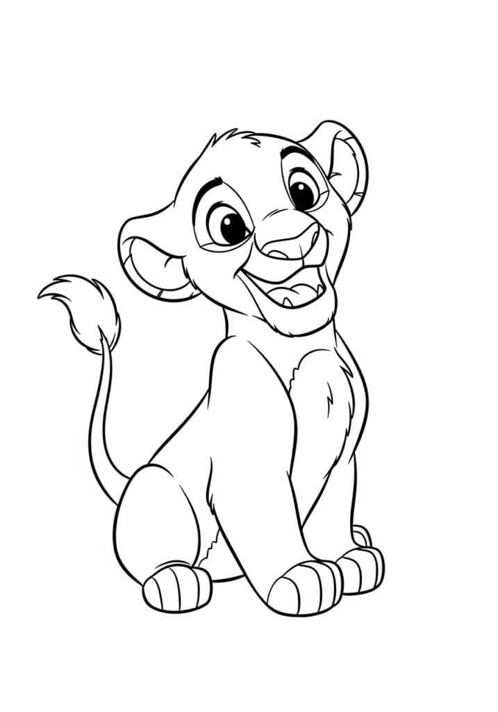 This coloring page features the most irresistibly cute little lion cub sitting upright and grinning from ear to ear like he just heard the funniest joke in the savanna. His oversized round head, big expressive eyes, and chubby little body give him that classic baby animal cartoon charm that is basically impossible not to love. The line work has a lovely mix of bold outer outlines and softer inner detail lines, with small textured strokes around his face and ears to hint at that fluffy cub fur. His curled tail pops up on the left side, his chunky little paws show off neat claw details at the bottom, and the whole character sits centered on a clean white background that gives you plenty of breathing room while you color.