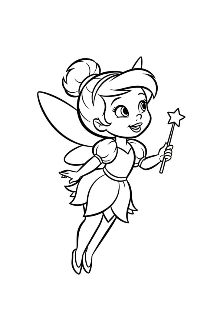 This page gives me such a happy, whimsical feeling every time I look at it, and I think a big part of that is the dynamic flying pose. It makes the whole page feel alive and full of energy rather than just a static stand-and-smile composition. I love coloring those petal layers on the skirt in slightly different shades of the same color to create a subtle gradient effect, and the wings are such a fun creative opportunity because you can go classic sheer and keep them very pale, or go completely wild with iridescent greens and purples. The star wand is a tiny but mighty detail that is really satisfying to finish off with a bright pop of yellow or gold. It is a genuinely joyful little page from start to finish.