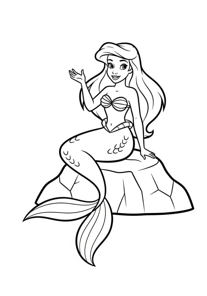 This coloring page shows a gorgeous mermaid princess perched gracefully on a large flat rock, her long flowing hair cascading all the way down past her waist and her tail curling elegantly off the side of the rock beneath her. She has a sweet open expression and one hand raised in a gentle wave, giving the whole image a warm and friendly energy. Her iconic shell top has lovely ribbed detailing, and her tail features clusters of curved scale shapes along the sides that add just the right amount of texture without being overwhelming. The line work is clean and confident throughout, with bold outlines defining the main shapes and softer inner lines used for the hair flow, scale details, and the geometric cracked surface of the rock beneath her.