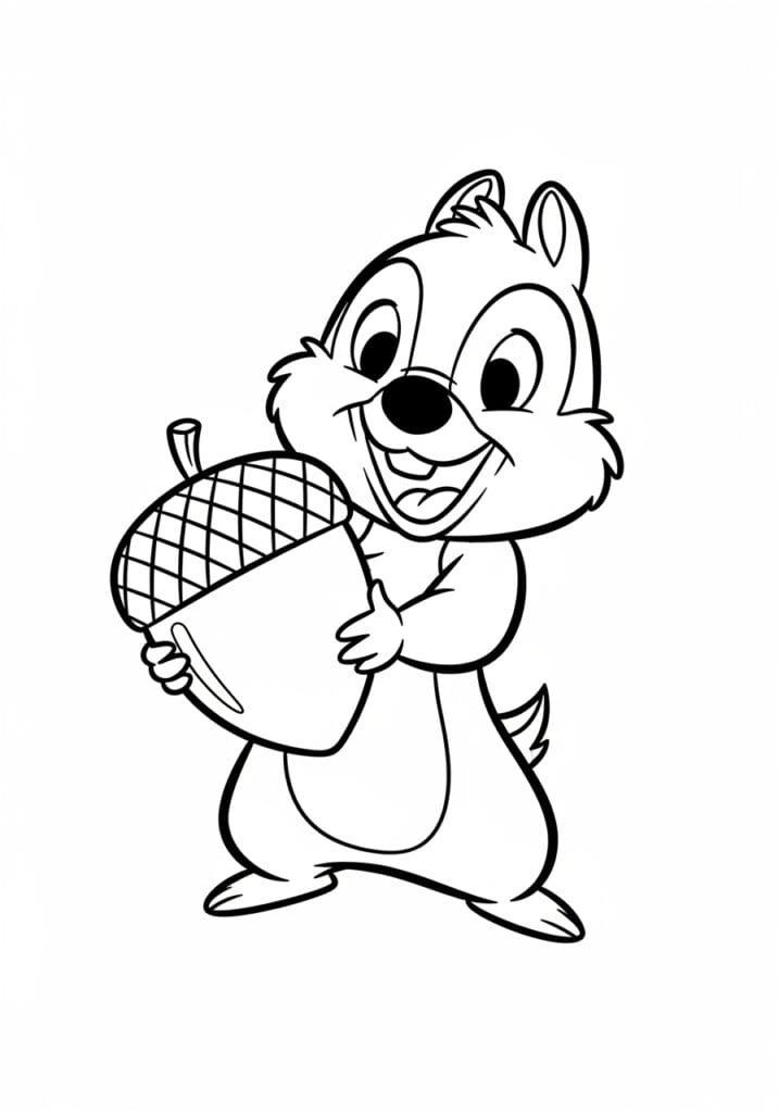 This coloring page features an absolutely delightful little chipmunk standing upright and clutching an oversized acorn to his chest like it is the most precious thing in the whole world, which honestly same. His round face is full of joy with big glossy eyes, a wide grin showing his little buck teeth, and fluffy cheeks that look like they are already stuffed with snacks. The acorn is a standout detail on this page, with a lovely crosshatch pattern across the cap that adds a really satisfying textured section to color. The line work is thick and bold throughout the whole design, giving it that classic cartoon style that is so clean and easy to work with, and the character sits centered on a bright white background that keeps all the focus on his ridiculously cute little face.