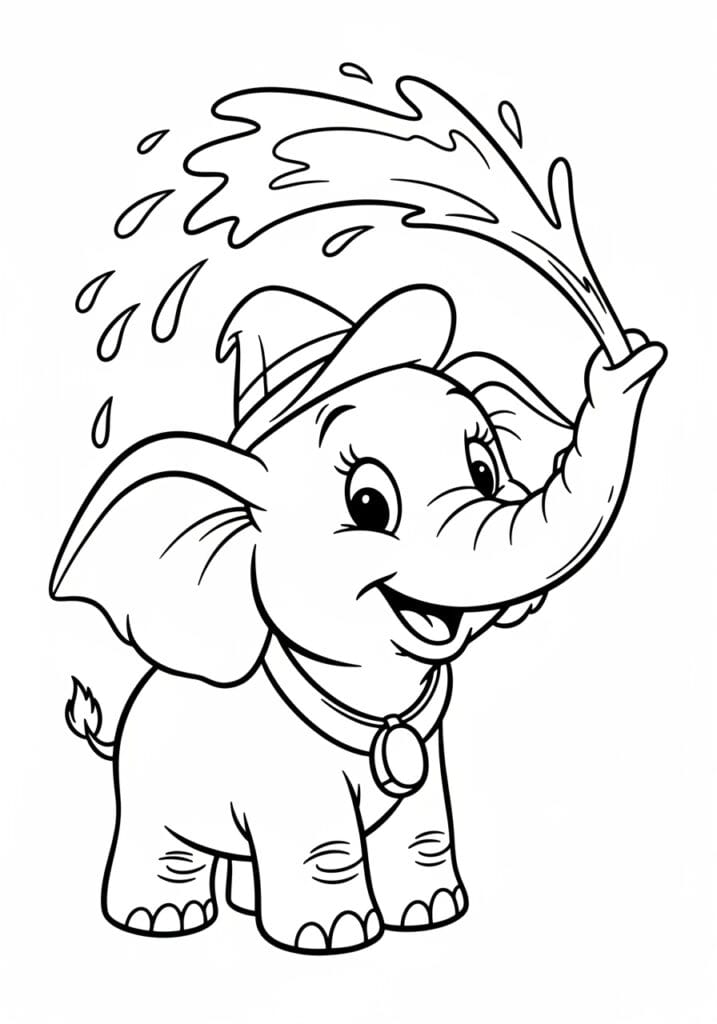What I absolutely love about this page is how much movement and energy it has. That water splash across the top is genuinely one of the most fun things to color because you can make it any shade you like and use light wispy strokes to suggest that airy splashy feeling. I like doing the water in soft aqua blues with tiny white highlights left uncolored to make it look like it is really flying through the air. Then the elephant himself is such a joy to fill in with soft grey or even a slightly warmer lavender grey if you are feeling a little creative. The droplets scattered around the page act like little bonus details that keep the whole coloring experience feeling playful and fresh right up until the very last one.
