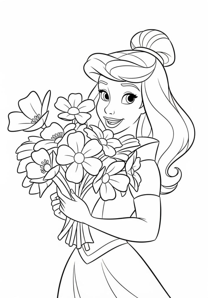 This is the kind of page that flower lovers are going to completely lose themselves in and I am absolutely one of those people. Each individual flower in that bouquet is its own little coloring adventure, and the mix of shapes and sizes means you can create a really lush and varied color palette without it feeling random or chaotic. I love picking a seasonal theme for bouquets like this one, so sometimes I go full spring with pinks, yellows and soft lilacs, and other times I go for a moody autumn vibe with burnt oranges and deep reds. The princess herself is a lovely counterbalance to all that floral detail, with her smooth hair and soft dress giving your hand a little break between all those petals.