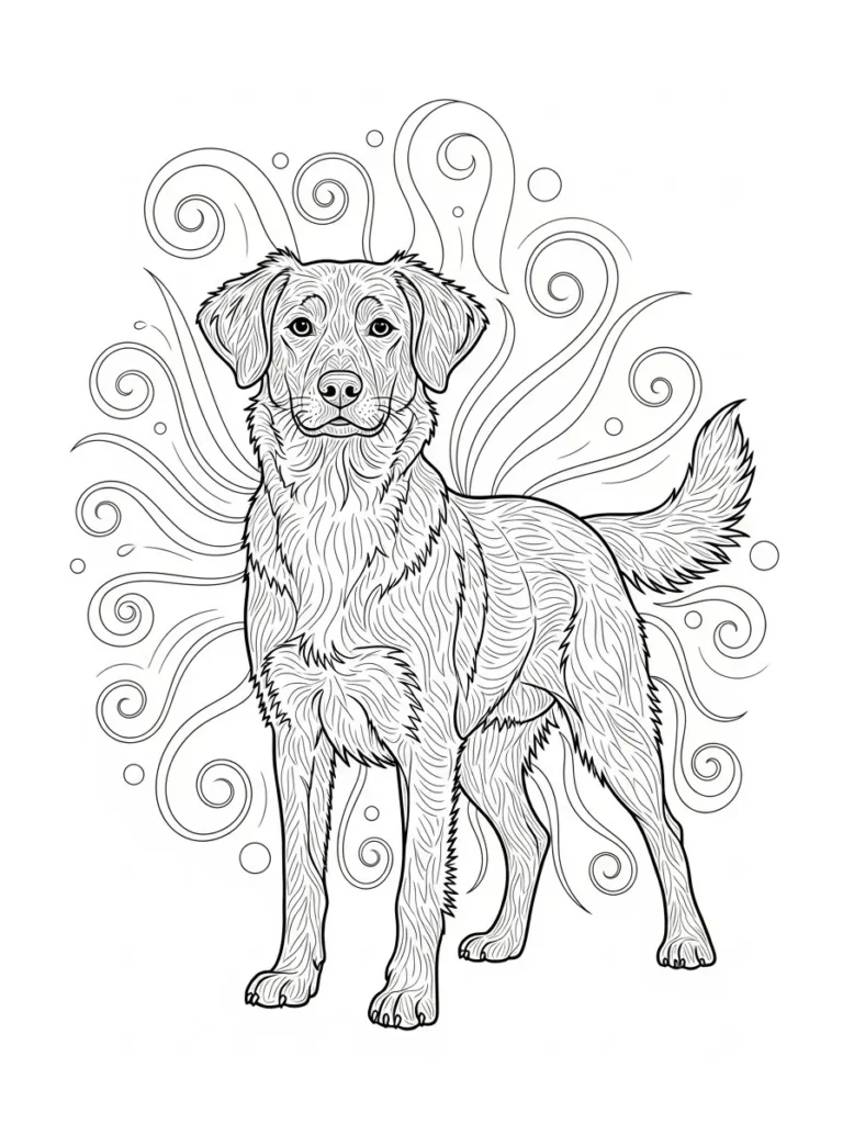 I find this page super engaging because the swirling background adds so much energy to the dog’s pose. Coloring this one is going to be a fantastic challenge in color application. I think I will use bright, energetic colors for the swirls, perhaps oranges and yellows to look like sunny energy bursting around the dog. Then I can use richer, deeper browns or golds on the dog’s body, letting the flowing lines guide my shading choices. It really satisfies that part of my brain that loves complicated patterns, and the bold outlines make sure the dog stands out no matter how wild my background gets.