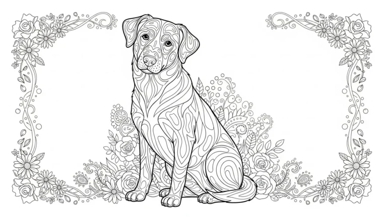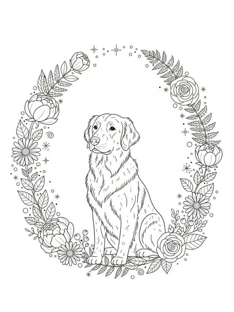 This coloring page appeals directly to my love for classic, gentle beauty. I think I will use soft, natural colors for the dog—lots of creamy golds and soft browns—to really capture that beloved Golden Retriever look. Then, I can have so much fun with the floral wreath, making each flower a different gorgeous shade, perhaps leaning into a vintage botanical illustration style. It’s relaxing because the dog itself isn’t overwhelmingly busy, giving my eyes a rest, but the detailed flowers provide enough intricate areas to keep my coloring pencils busy for a satisfyingly long time.