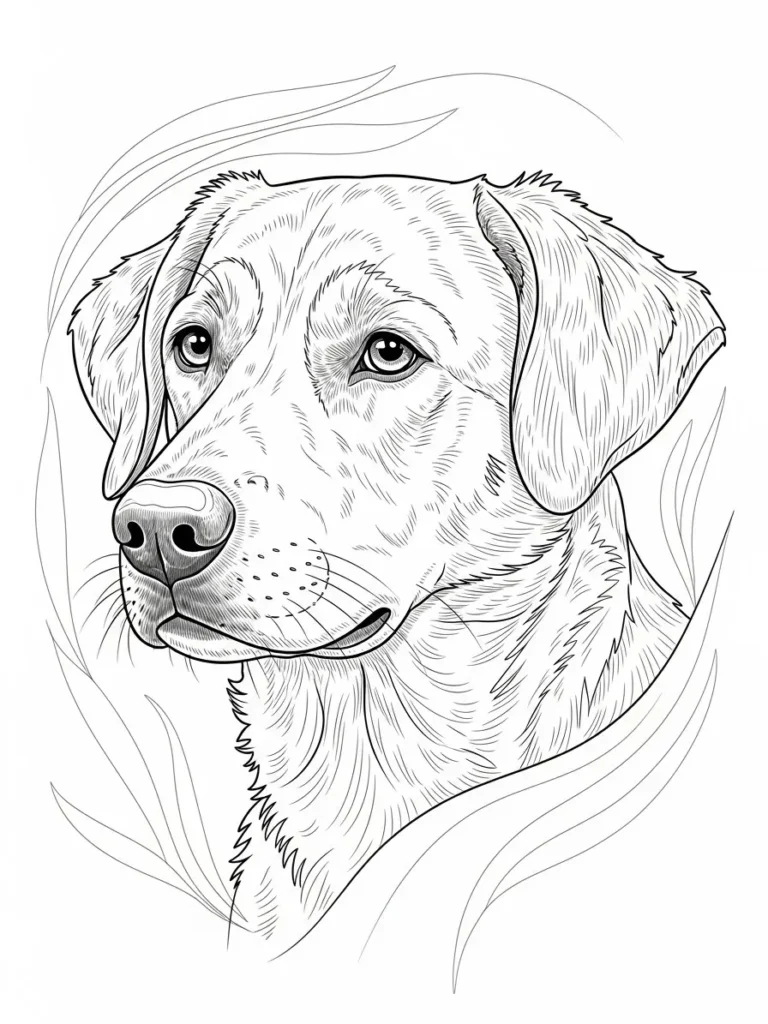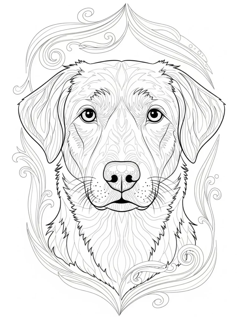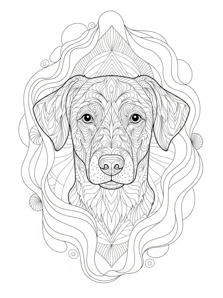This powerful portrait focuses entirely on the head and shoulders of a beautiful Labrador type dog, framed by flowing, wavy ornamental lines that give the composition an ethereal, almost psychedelic feel. The dog’s face is the star, meticulously detailed with fine, curving lines that flow over the muzzle, around the eyes, and up the forehead, creating an elaborate, almost Paisley-like pattern within the realistic structure. The outer border flows like soft waves or scarves, complete with small circular accents scattered throughout. The line work is very fine, making this an intense concentration challenge.