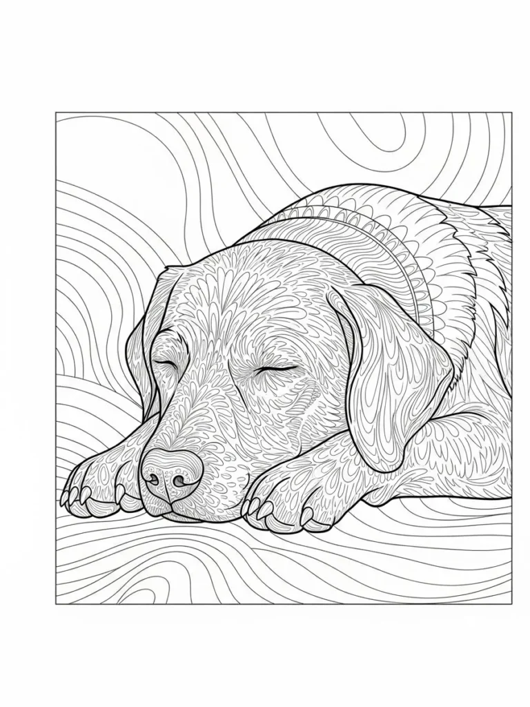 Coloring this page feels like the ultimate relaxation exercise for my busy brain. I adore how the swirling lines on the dog’s body naturally suggest shading, making it easy to layer colors subtly to create depth and warmth. I plan on using deep indigo blues and gentle grays for the background waves to enhance the sleepy atmosphere, while giving the dog soft, warm earth tones. It is engaging because it encourages me to use slow, deliberate strokes following the existing lines, which is just perfect for achieving that deep, calming focus I seek when I sit down with my coloring supplies.