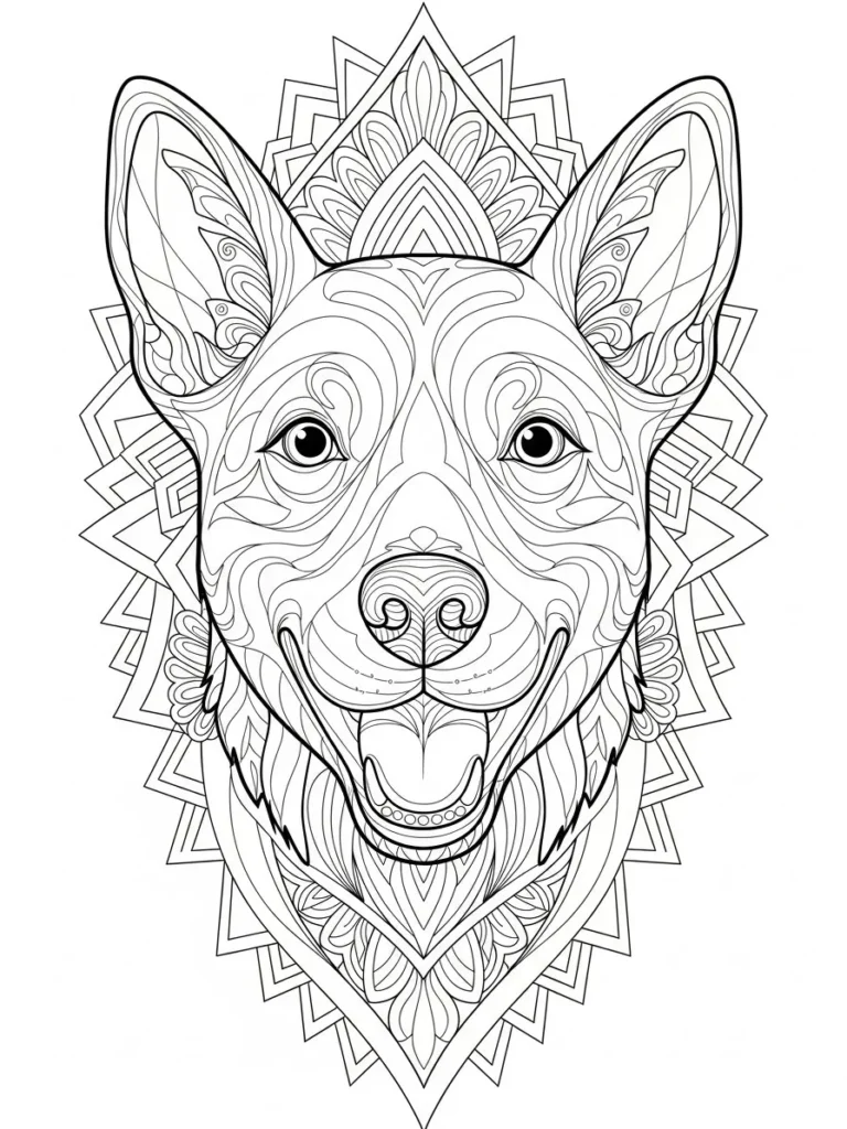 This vibrant coloring page features a close-up portrait of a very happy dog, mouth open in a panting smile, showcasing erect ears and bright eyes. The entire design is a gorgeous fusion of realism and detailed pattern work. The dog’s face and ears are filled with fine, flowing lines that suggest texture and form, while the background explodes outwards in a perfectly symmetrical, layered mandala shape made up of repeating triangular and petal motifs. The overall composition is intensely detailed and centered, framed by the mandala structure.