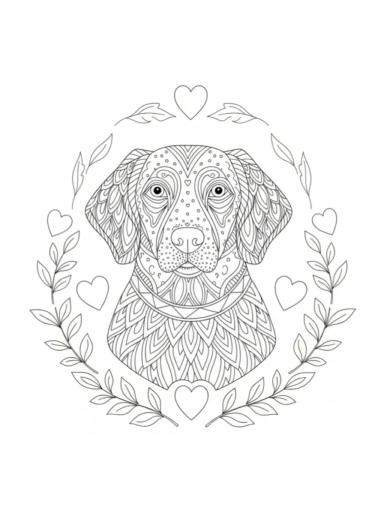 This stunning composition centers on the face of a sweet dog, intricately decorated with fine, flowing patterns that fill its entire head, ears, and neck area. The dog is nestled perfectly within a large, nearly circular wreath made up of stylized leaves, roses, and daisies, interspersed with small hearts and tiny star-like details. The design has a strong sense of symmetry, especially with the decorative elements framing the dog’s gentle, wide-eyed expression. The line work is very detailed and fine, characteristic of complex adult coloring pages.