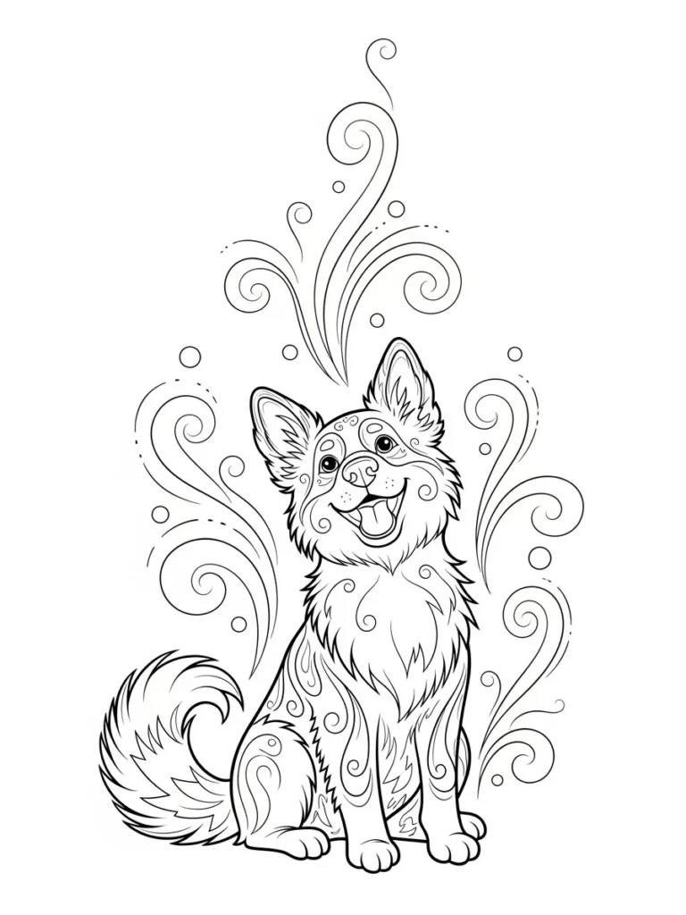 • Happy Doodle Dog with Whimsical Swirls Coloring Page
