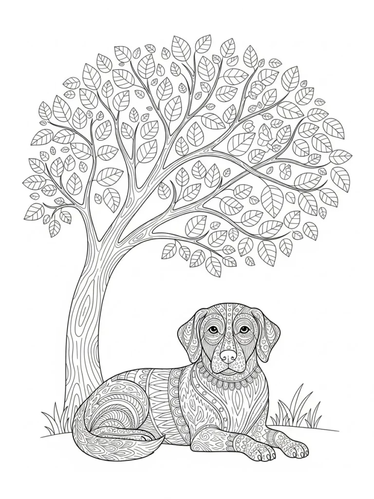 This coloring page features an absolutely charming dog, perhaps a sweet Labrador mix, resting peacefully beneath the sprawling branches of a detailed tree. The dog’s coat is a canvas for intricate zentangle-inspired patterns featuring swirls spirals and delicate floral motifs that make every inch a textural delight. The tree above is equally captivating with numerous layered leaves and visible bark texture giving the whole scene a lovely organic feel. The line work is beautifully crisp and varied providing plenty of contrast between the dense patterns on the dog and the lighter outlines of the natural surroundings.