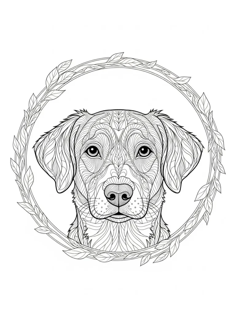 • Detailed Dog Portrait in a Leafy Frame Coloring Page