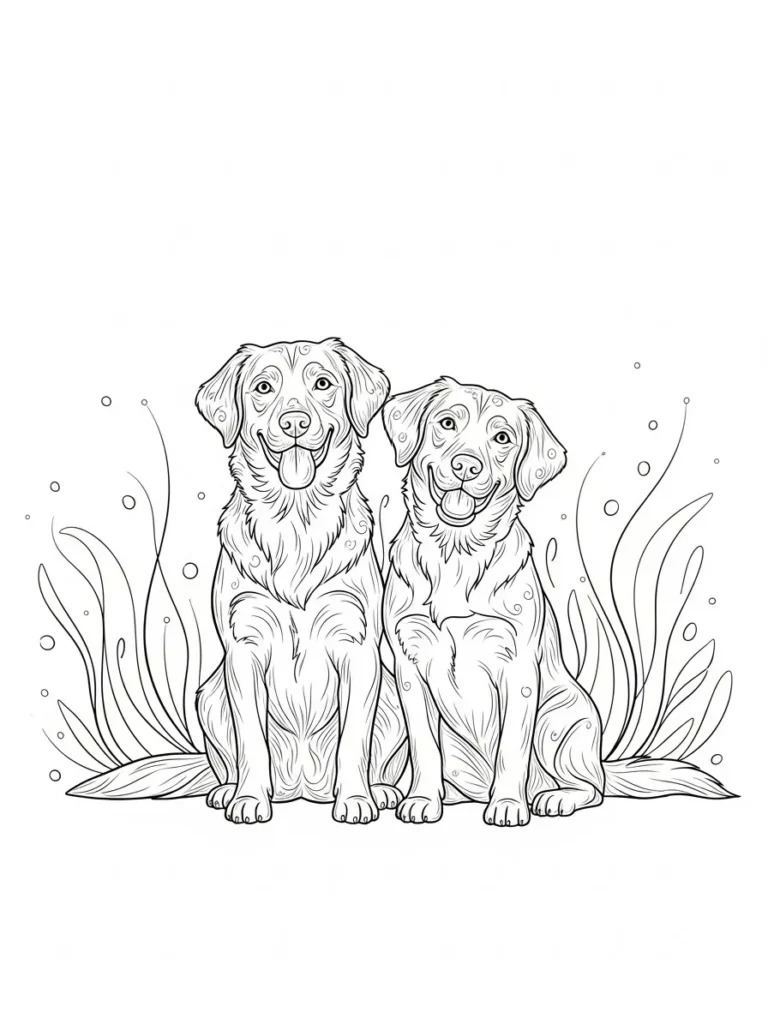 This coloring sheet perfectly captures the joyful spirit of two happy dogs likely best friends or siblings sitting side-by-side. Both pups who appear to be retrievers or similar breeds are smiling brightly with their tongues slightly out suggesting they are ready for a walk or a treat. The drawing style uses clean outlines for the main figures but incorporates whimsical swirls and subtle internal line patterns on their fur giving them an artistic flair without being overwhelming. They are framed by elegant tall blades of grass rendered with thin flowing lines that add movement and freshness to the composition.