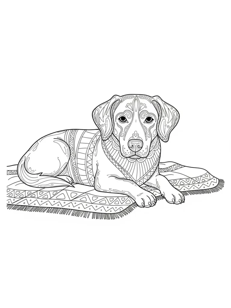 This image showcases a lovely dog resting contentedly on a patterned mat or rug looking directly at us with calm eyes. The entire composition focuses on this central figure the dog which has large areas of its body adorned with beautiful tribal or bohemian inspired geometric patterns particularly around the neck chest and parts of the flank. The mat underneath features its own repeating triangular and dotted motif complete with a fringed edge. The line work is a mix of bolder outlines for the dog’s shape and finer internal lines for all the wonderful decorative elements.