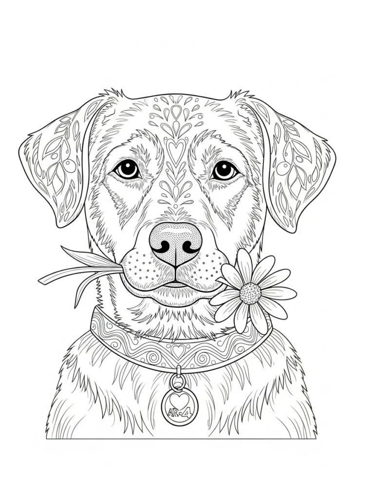 This coloring page presents a gorgeous close-up of a dog’s face, likely a Labrador mix, looking directly at us with sweet, expressive eyes. What makes this design so charming is the intricate decoration layered over the realistic features. The forehead and ears are adorned with delicate, symmetrical floral and heart patterns typical of folk art or ornamental tattoos, while the ruff of fur around the neck is looser and more natural. The dog is holding a lovely daisy and stem gently in its mouth, complemented by a patterned collar featuring a heart-shaped tag. The line work is a wonderful mix of fine detail within the patterns and slightly bolder outlines defining the dog’s structure.