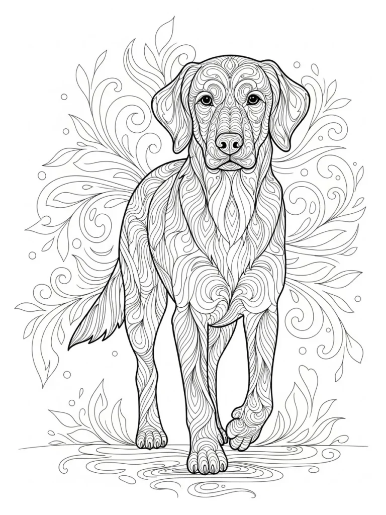 This image showcases a striking, full-bodied dog, perhaps a Labrador, stepping forward with confidence and a direct gaze. The entire silhouette of the dog is filled with tightly packed, flowing, curved lines that mimic liquid movement or stylized feathering, creating an optical illusion of texture across its body. This richly patterned dog is set against a background composed of large, ethereal swirls and leaf motifs that frame the subject beautifully. The line work is very fine and highly detailed, demanding close concentration for application.