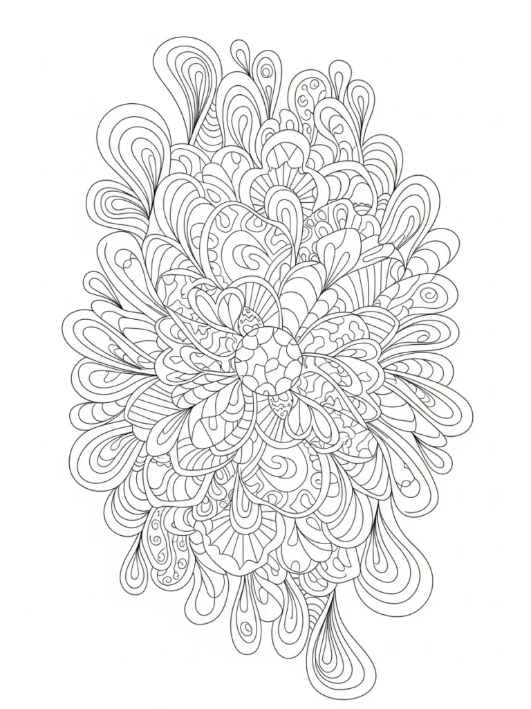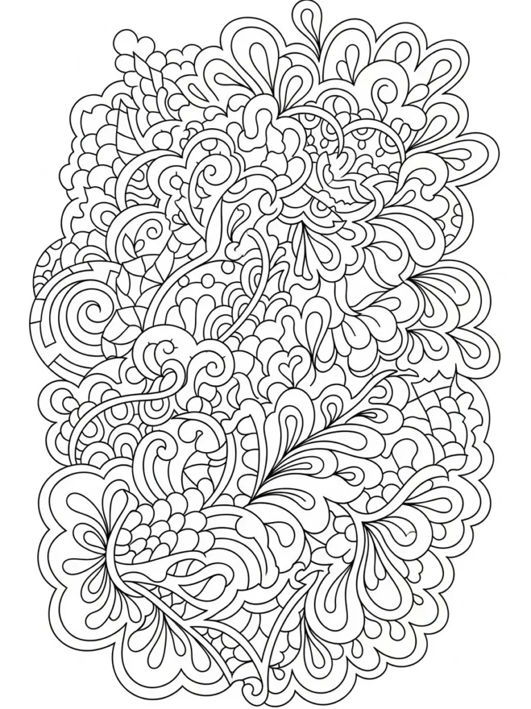 This coloring page flows with layers of rounded petal shapes gentle spirals and leafy curves that stack into a tall cascading layout. The patterns feel soft and airy with repeated teardrop forms scalloped edges and subtle textures tucked inside larger shapes. Line thickness stays smooth and even which gives the whole page a calm cohesive look while still offering lots of little spaces to explore with color.