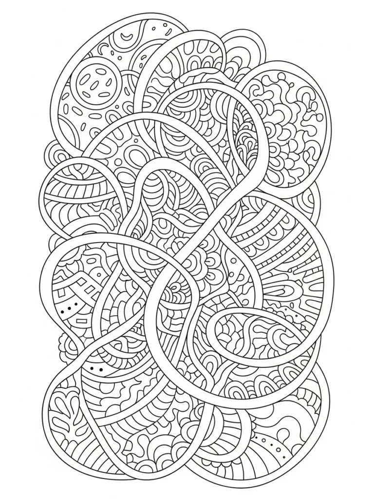 This coloring page is built around thick looping ribbons that twist and overlap across the page creating a fun tangled look. Inside and around those loops you will find smaller doodle patterns like waves dots scallops and curved textures that fill the space without feeling chaotic. The contrast between the bold outer loops and the finer inner details gives the whole design a playful layered feel that still feels balanced and intentional.