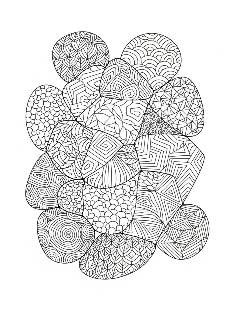 This coloring page is made up of overlapping rounded shapes that come together like a playful patchwork flower. Each section is filled with its own unique pattern including scales spirals zigzags waves and geometric lines which keeps the whole design visually interesting. The linework is clean and consistent and the overall layout feels balanced even though every shape has its own personality. It has that satisfying mix of order and creativity that makes doodle pages so fun.