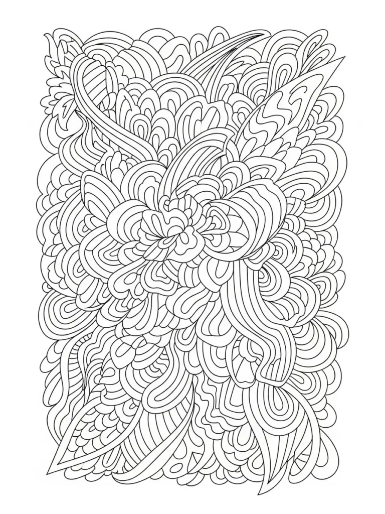 This coloring page features a lush vertical bloom made from layered ribbon like curves soft petals and looping lines that fold and overlap in a very fluid way. The design feels full and energetic with repeating wave patterns feathered shapes and rounded edges that create a sense of motion from top to bottom. Line thickness stays smooth and even which helps the many details feel cohesive instead of cluttered while still giving you tons of little spaces to enjoy.