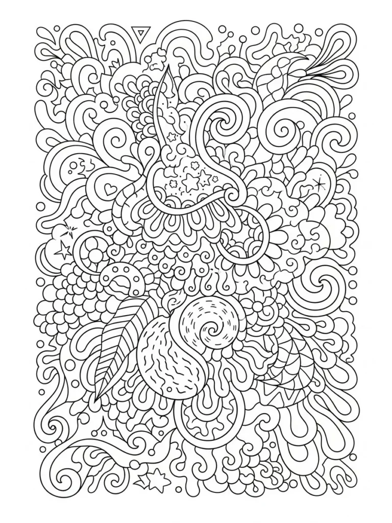 This coloring page is a joyful swirl of playful doodles filled with stars hearts curling lines and soft organic shapes layered from top to bottom. The design feels imaginative and dreamy with spirals bubbles leaf like forms and little decorative details tucked into every corner. The linework stays smooth and consistent which keeps the busy layout feeling friendly instead of overwhelming. Everything flows together in a loose storybook style that invites your eyes to wander.