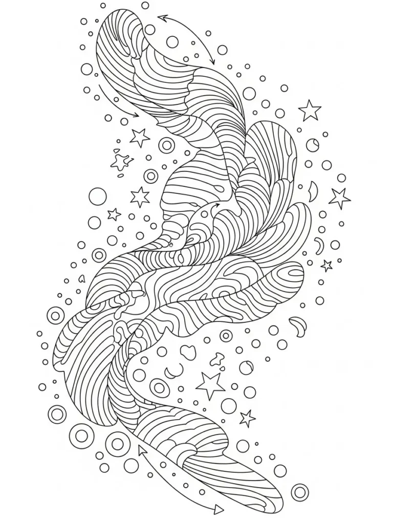 This coloring page features a flowing ribbon like form that twists and curves down the page surrounded by playful stars dots arrows and tiny cosmic shapes. The main structure is made up of layered wavy lines that give the design a sense of movement almost like it is floating through space. Line thickness stays clean and even which keeps everything feeling light and airy while still offering plenty of detail to enjoy.
