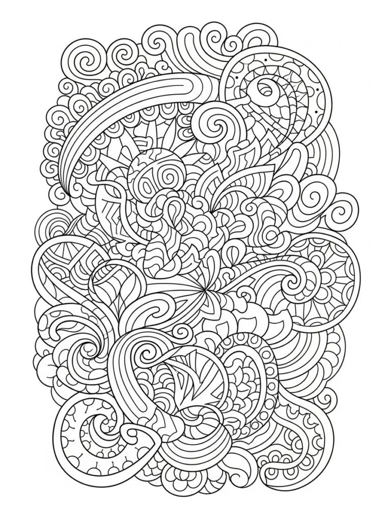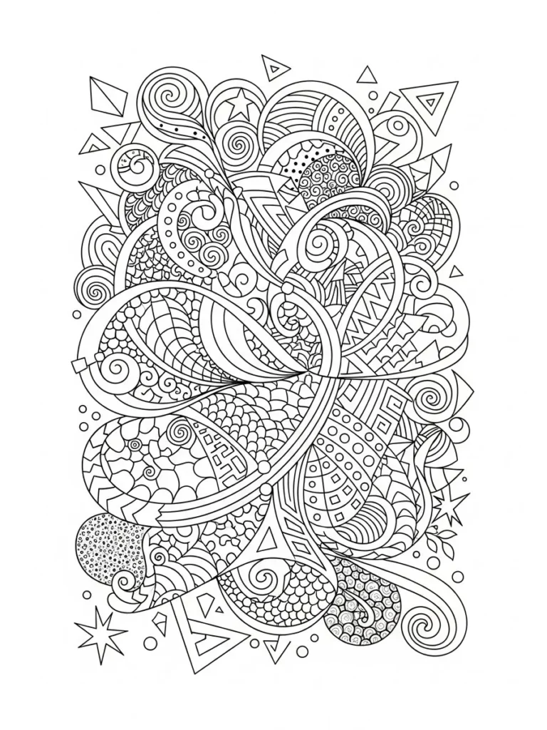 This coloring page is a lively mix of swirling ribbons geometric accents and textured doodle patterns all layered into a tall energetic composition. Curves loops zigzags dots and triangles overlap freely which gives the design a playful almost rhythmic feel. The linework stays clean and consistent while mixing bold sweeping shapes with smaller detailed sections so the page feels full without feeling messy or crowded.
