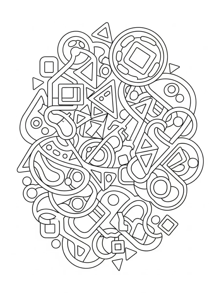 This coloring page features a bold cluster of abstract geometric doodles layered into a loose rounded shape. Circles triangles squares and curved connectors overlap and weave together creating a fun almost puzzle like layout. The lines are smooth and slightly thicker which makes each shape feel clear and confident while still keeping things playful. I love how the mix of sharp angles and soft curves creates contrast without feeling rigid or overly structured.