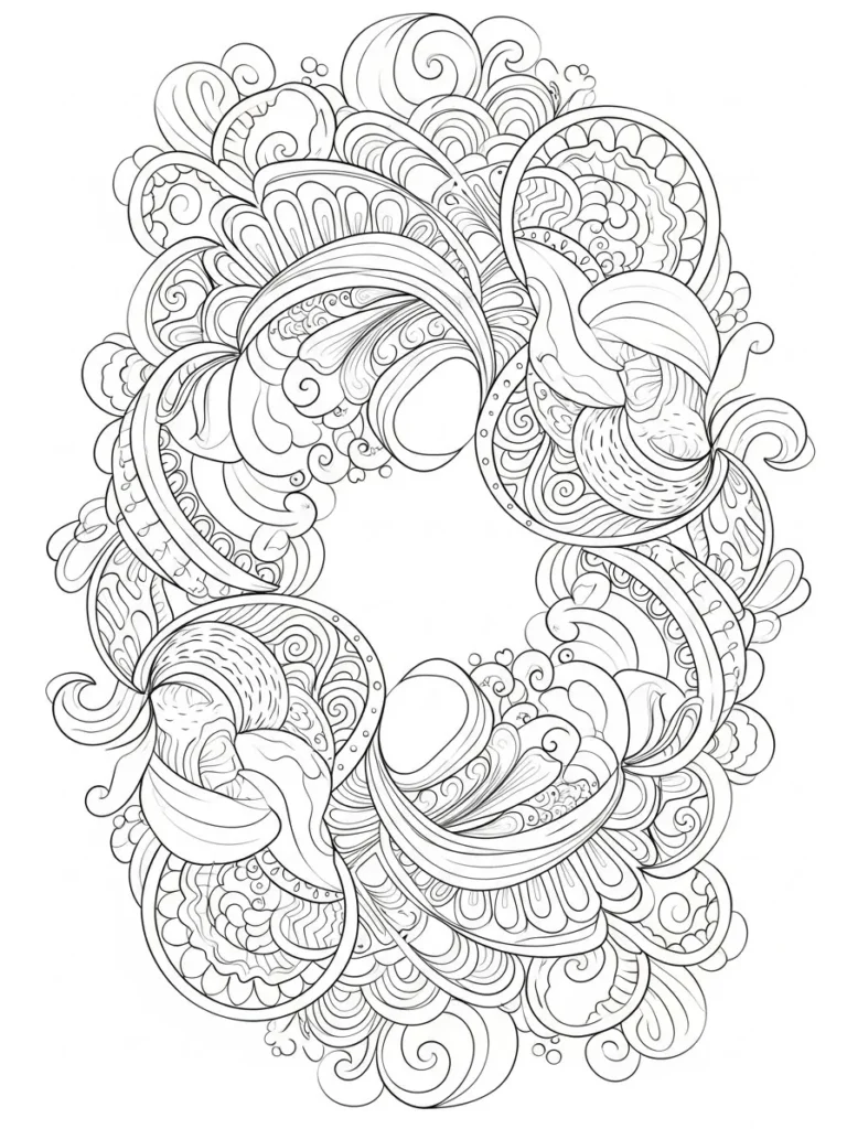 This coloring page forms a loose circular wreath made from swirling ribbons petal shapes and soft abstract curves that wrap around an open center. The design feels airy and elegant with layered loops scalloped details and gentle textures filling each section. Line thickness stays smooth and even which keeps everything cohesive while still offering lots of tiny areas to color. The open middle gives the whole page a light balanced feel instead of feeling crowded.