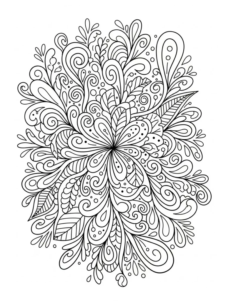 This coloring page features a lively floral inspired doodle bursting with layered petals swirling shapes and playful organic patterns. The design feels loose and free with flowing lines that vary gently in thickness which keeps the whole page dynamic and expressive. Curved teardrops loops and abstract petal forms overlap and radiate outward creating a full bodied composition that feels hand drawn and spontaneous rather than perfectly symmetrical.