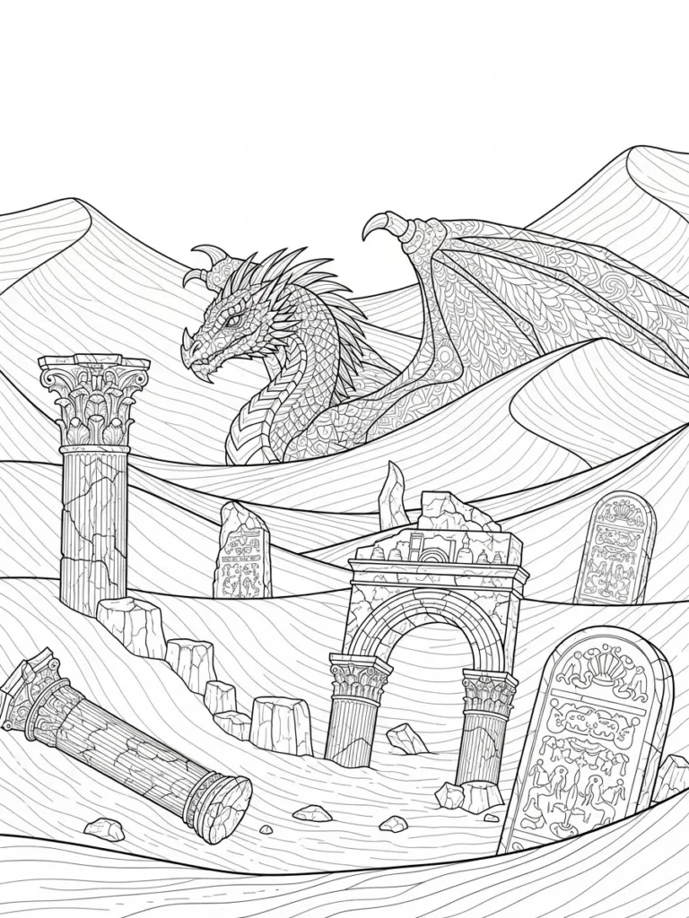 This coloring page features a powerful dragon rising through rolling desert dunes surrounded by ancient ruins and broken stone arches. The dragon is highly detailed with layered scales intricate wing patterns and sharp curved horns that give it a fierce but elegant presence. Flowing lines create movement across the sand while carved pillars fallen columns and engraved stone tablets add rich texture and storytelling details. The line work is clean and fine making the entire scene feel immersive and thoughtfully balanced from foreground ruins to the sweeping background hills.