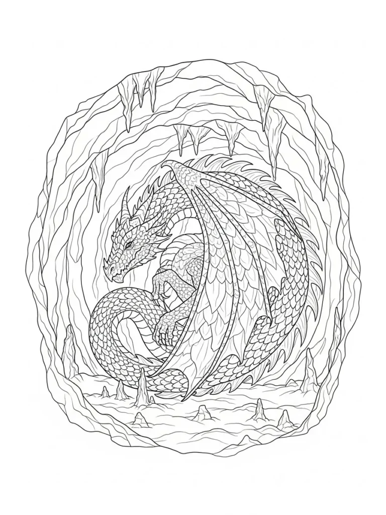 This coloring page shows a beautifully detailed dragon resting inside a circular cave framed by rough stone walls and hanging stalactites. The dragon is curled inward with its wings folded close creating a cozy enclosed composition that feels balanced and intentional. Layered scales cover the body wings and tail with fine repeating patterns that add texture and depth. The cave walls feature flowing rock lines and pointed formations that contrast nicely with the smooth curves of the dragon. The line work is clean and delicate with plenty of detail packed into a calm contained layout.