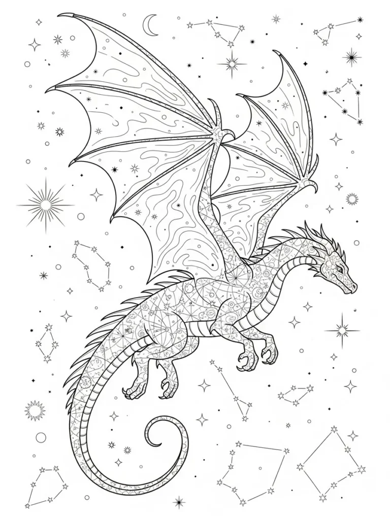 This coloring page features an elegant dragon gliding through a night sky filled with stars constellations and crescent moons. The dragon’s wings are wide and airy with flowing vein patterns that feel light and magical while the body is covered in delicate decorative markings and fine scales. Tiny stars and celestial symbols surround the dragon and create a dreamy cosmic atmosphere without overwhelming the main figure. The line work is thin and graceful with a lovely balance of detailed sections and open space that keeps the whole design feeling soft and whimsical.