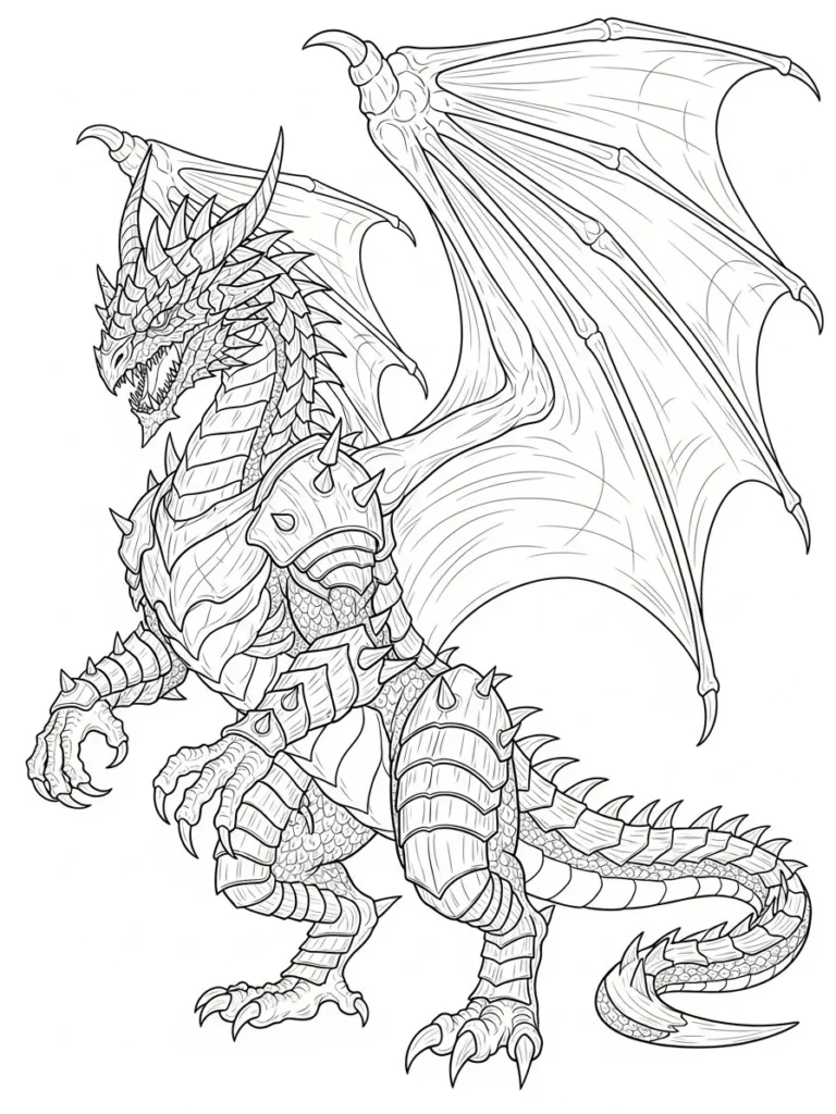 This coloring page features a powerful dragon standing tall with heavy armor plates covering its chest shoulders and legs. Sharp spikes and layered segments give the dragon a bold battle ready look while the wings stretch wide with long smooth sections that contrast against the detailed armor. The body and tail are filled with tight scale patterns that flow naturally and keep the design cohesive from head to claw. Clean precise line work makes every plate spike and scale feel crisp and satisfying to color while the open background keeps the focus fully on the dragon.