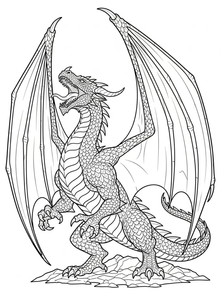 This coloring page shows a fierce dragon standing proudly on a rocky surface with its wings lifted high and mouth open in a powerful roar. The dragon is covered in layered scale patterns that flow smoothly across the body neck and tail while the wings feature long clean sections framed by strong outlines. Sharp claws horns and teeth add to the dramatic fantasy feel without overcrowding the design. The line work is crisp and bold which makes each section clear and satisfying to color while keeping the overall layout balanced and striking.