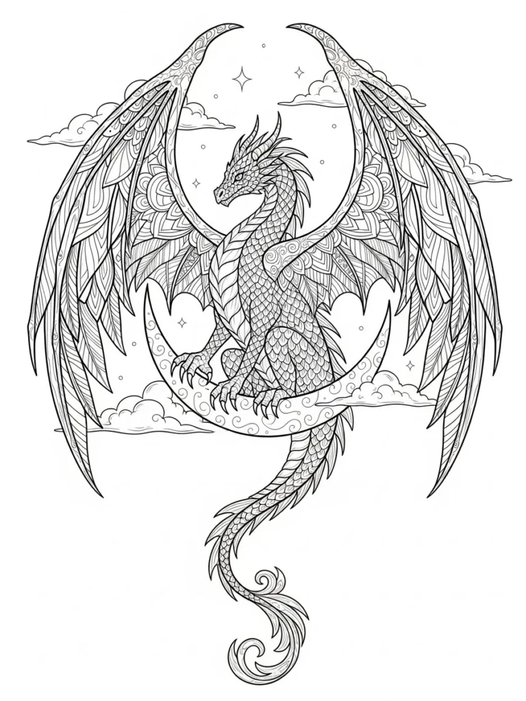This coloring page features an elegant dragon perched beneath a crescent moon with its wings curved gracefully around its body. The wings are filled with intricate layered patterns that feel almost mandala inspired while the dragon itself is covered in delicate scales that flow smoothly from head to tail. Soft clouds and tiny star details frame the scene and add a dreamy night sky atmosphere without overpowering the main figure. The line work is fine and detailed with a beautiful balance between ornate sections and open space which makes the overall layout feel light and harmonious.