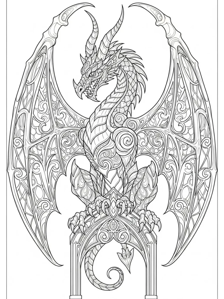 This coloring page features a dramatic dragon perched atop an ornate stone arch with its wings stretched wide in a powerful symmetrical pose. The wings are filled with swirling gothic inspired patterns that feel rich and decorative while the dragon body is covered in layered scales and sharp elegant details. Curved horns claws and tail add to the regal fantasy vibe and the architectural arch beneath grounds the design beautifully. The line work is fine and consistent with lots of intricate sections balanced by clean open spaces that keep the layout bold but not overwhelming.