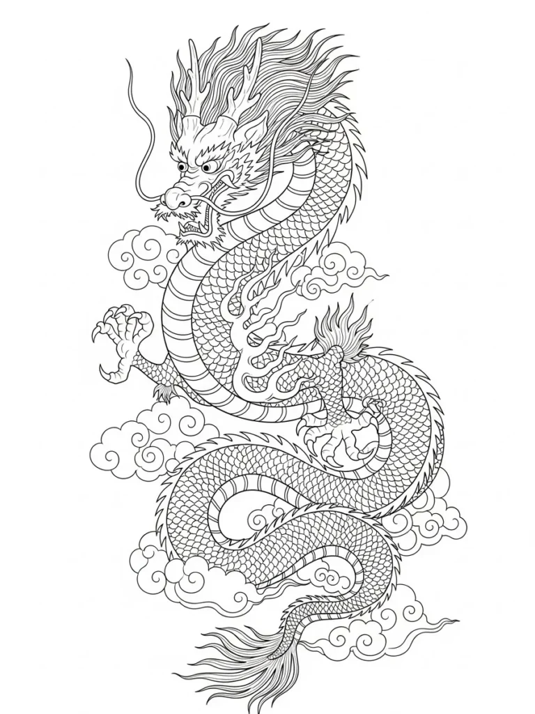 This coloring page features a long elegant eastern style dragon winding gracefully through soft swirling clouds. The dragon body is covered in neat repeating scales that follow the curves of its movement while flowing whiskers spiked fins and a fiery mane add personality and motion. Curled cloud motifs surround the dragon and help guide the eye up and down the composition. The line work is clean and detailed with a beautiful rhythm that feels intricate without becoming too heavy which makes the overall layout feel balanced and dynamic.