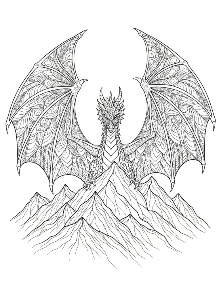This coloring page shows a majestic dragon perched proudly atop a range of sharp mountain peaks with its wings fully spread in a striking symmetrical pose. The wings are filled with intricate flowing patterns that feel almost feathered and ornamental while the dragon’s body features layered scales that add texture without overpowering the scene. Clean mountain lines sit below the dragon and create a strong grounded base that contrasts beautifully with the detailed wings above. The line work is crisp and fine with a lovely balance of ornate detail and open space that keeps the whole design feeling airy and dramatic.