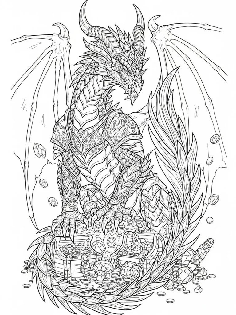 This coloring page features a fierce dragon perched proudly on a chest overflowing with coins gems and treasures. The dragon is covered in beautifully detailed armor plates with swirling decorative patterns that flow across the chest arms and shoulders. Large wings frame the scene while the tail curves around the treasure pile adding movement and balance. Scattered coins crystals and jewels fill the foreground and create lots of small satisfying areas to color. The line work is crisp and intricate with a rich mix of textures that keep the design visually exciting.