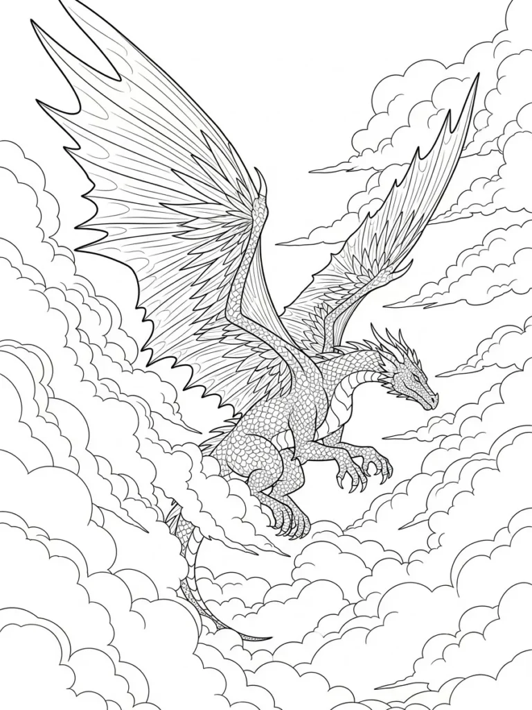 This coloring page captures a graceful dragon soaring effortlessly through thick rolling clouds with its wings stretched wide across the sky. The wings feature long flowing feather like sections that create a strong sense of movement while the dragon’s body is covered in fine layered scales that add texture and depth. Soft cloud shapes surround the dragon and frame the scene without overpowering it. The line work is clean and balanced with detailed sections in the dragon paired with open airy space in the clouds for a light dramatic layout.