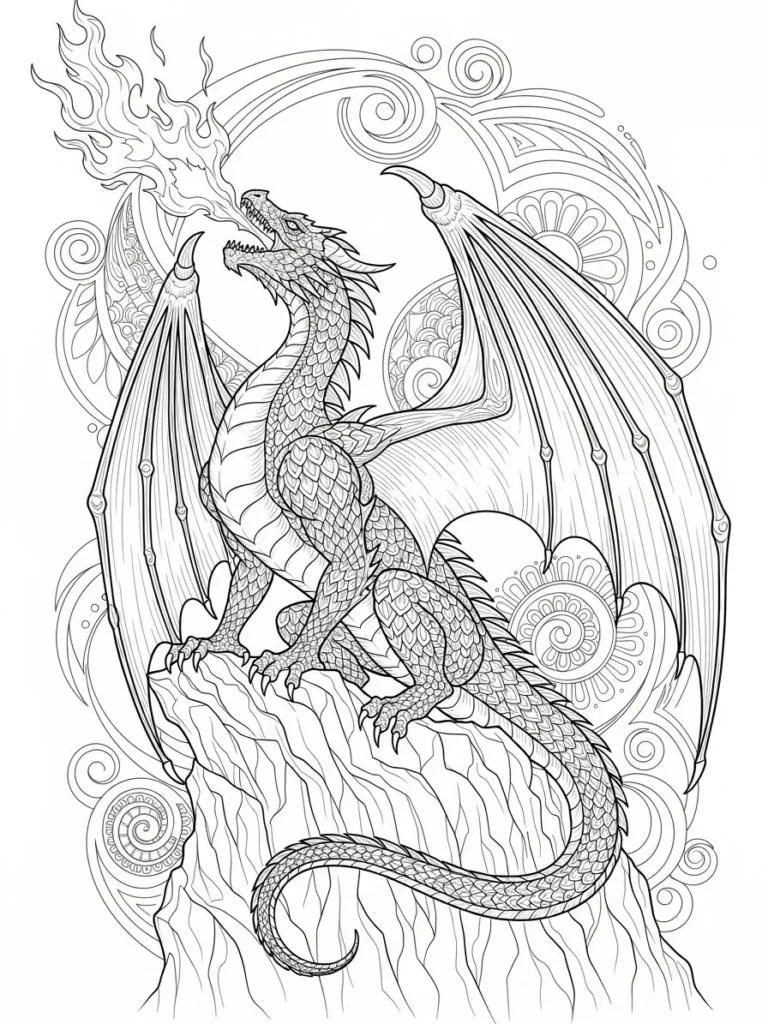 This coloring page features a dramatic dragon standing tall on a rocky ledge while breathing a stream of fire into the air. The dragon’s body is filled with layered scales and bold contours while the wings stretch wide with long smooth panels that balance the intricate details below. Swirling decorative patterns and circular motifs surround the dragon and create a sense of movement and energy throughout the entire composition. The line work is clean and fine with a satisfying mix of detailed textures and open spaces that keep the design rich but approachable.