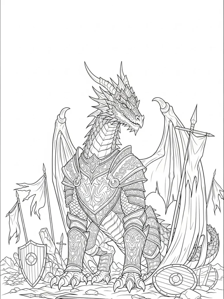 This coloring page features a proud armored dragon standing tall on a battlefield scattered with broken shields spears and tattered banners. The dragon wears ornate armor plates across its chest arms and legs with swirling engraved patterns that add a regal warrior feel. Large wings frame the scene and create strong vertical lines while the rocky ground and discarded weapons add storytelling detail. The line work is crisp and detailed with a great mix of armor textures smooth wing panels and rugged ground elements that keep the layout bold and grounded.